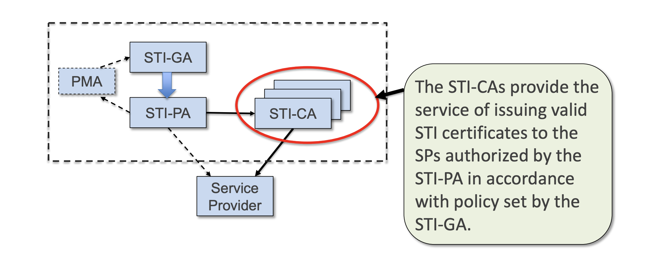 In the implementation of the STIR/SHAKEN framework there are several actors that are required to make the implementation happen - the Governance Authority (GA), the Policy Administrator (PA) and the Certificate Authority (CA). This diagram from ATIS shows the relationship between the various entities: