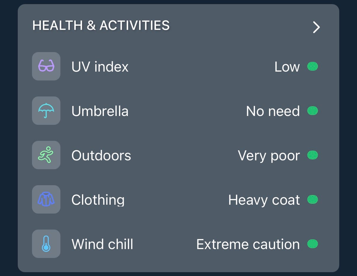 If “wind chill: extreme caution” is green, what does red even mean? Apocalypse?