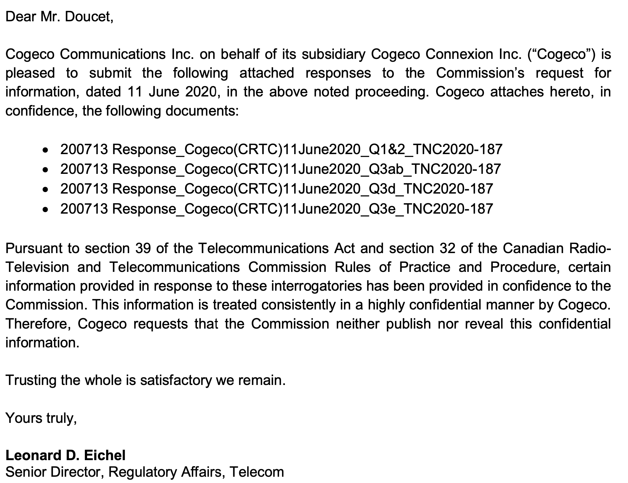 Responding to these Notices of Consultation and other CRTC matters is something the ISCC excels at - we have a broad member base and a strong policy committee filled with smart people who have intelligent views on matters such as this. But when we reviewed the information on the record so far in response to questions that the CRTC asked the incumbents, we found that the incumbents' filed virtually all responses in confidence to the CRTC. Cogeco even filed all of its responses fully in confidence with the CRTC: