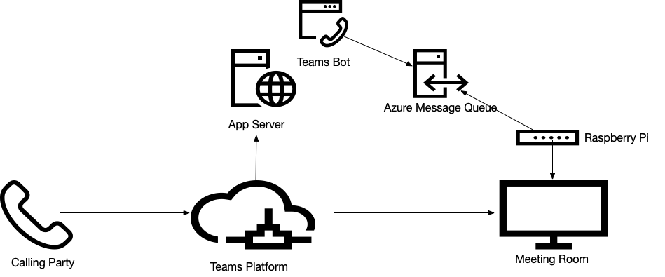 So putting it all together, when a call comes in for the user, the Teams platform brings a Bot into the call flow via simultaneous ring. That Bot posts a message to the Azure message queue, which is then picked up by a application inside the network running on a Raspberry pi, which in turn changes the TV input via the Samsung API.