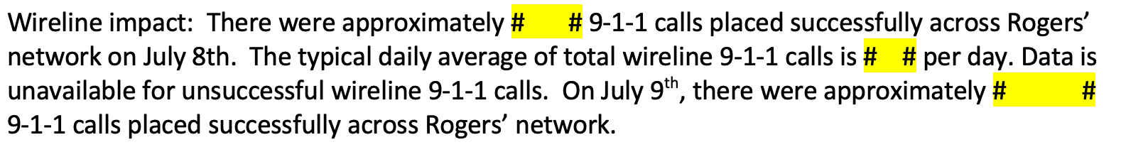 Late last night the CRTC posted the reply from Rogers to the request for information (RFI) it sent last week. In the RFI, the CRTC asked Rogers to respond to 55 questions about the multi-day Canada-wide service outage that started early in the morning of July 8th. Beyond the 55 questions in the RFI, the Commission clearly stated to Rogers that "In light of the immense public interest in understanding what happened, Commission staff expects Rogers to disclose information on the public record to the maximum extent possible." However, in reading the RFI response, it's clear Rogers didn't understand the assignment. The level of redaction in the document is mind-boggling - there are pages and pages with nothing but redacted text - hardly the maximum extent possible of disclosure. As an example, when it came to the question of in the impact to 911 services, Rogers redacted the call volumes for 911 calls - hardly something that any normal person would concider to be a trade secect: