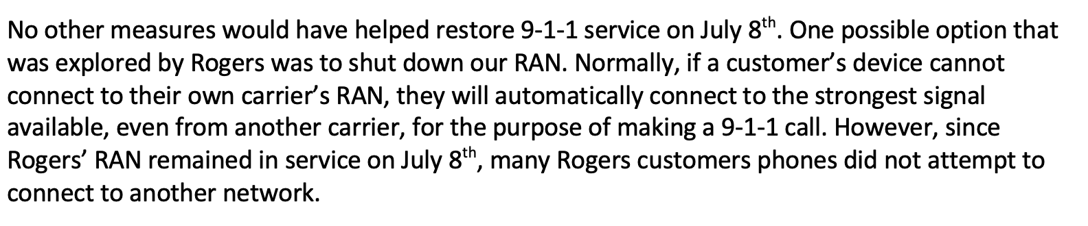 On a positive note, Rogers did confirm why 911 calls failed during the outage, which reaffirmed what I thought happened - because wireless devices could still see the Rogers network they did not attempt to failover to another network when a customer attempted to dial 911.