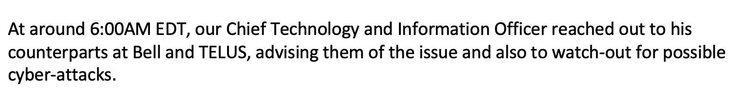 This tells us that for at least the first 90 minutes of the outage Rogers didn't know what was going on. If they had known during this time it was an issue with route filters they wouldn't have warned Bell and Telus since it clearly wasn't a cyber attack but rather a misconfiguration of core equiment by Rogers staff.