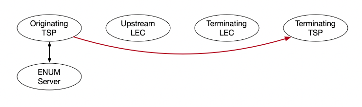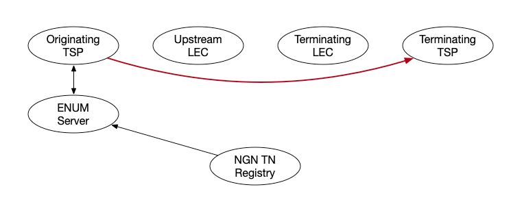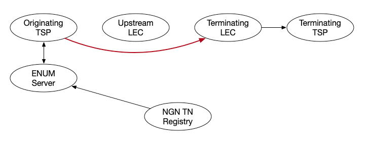In this case, because the originating TSP and the Terminating LEC are participants in the NGN Registry the call will route directly between them, and then take traditional routing to get to the Terminating TSP.